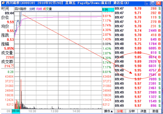 四川路桥(600039)2010年2月26日,2月份大盘正值平衡市状态,区域板块操作此起彼伏,该股当时处于趋势上升阶段,早盘出现了巨量高开,而且又出现了均线密集缠绕的最佳买点,当日实盘讲解时我就情不自禁的叹道形态真美,完全符合追涨法的七个条件,该股早盘半小时内三波涨停,属于白银级强势涨停标准,早盘巨量高开时朋友们可以小仓位买入,最后一笔大单封死涨停前再挂单买入,封死涨停后可再排队买入,很可惜,该股封死涨停后股价运行良好,分时看抛盘很小,盘中并未开盘,第三种买法是买不到了。
