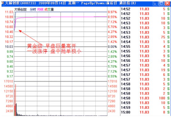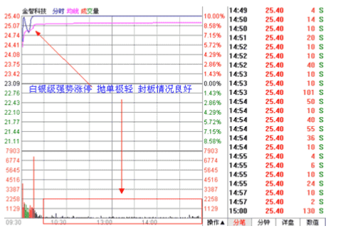 由于该股属于白银级强势涨停标准,且盘中分时抛盘极小,这种情况临盘时大可以放心一些,朋友们可用第三种均线卖法持股,直到股价跌破五日线再行卖出。很明显第一个涨停属于钻石级、黄金级、白银级的股票后市连续大幅拉升的概率就大一些,临盘时朋友的胆子自然可以相应的大一些。实战范例二和此股同理,朋友看下面的图示: