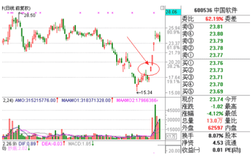 对于神州泰岳(300002),当日该股开盘巨量高开一字涨停,属于钻石级,但当日大盘剧烈震荡,该股盘中开板,给了千载难逢的买入机会,从K线图上看该股出现了均线买点,这根标志性的K线一举突破了下降趋势,临盘时再遇到这种情况胆子要大一些,追涨没商量。这个股是3G龙头,涨停前晚公司公布每10股送转15股的史无前例的高配送,加之优秀的年报业绩,波段涨幅又小,这个涨停板的作用是确立的上涨趋势,这样的涨停可以追。下面的实战范例五同样是这种情况。