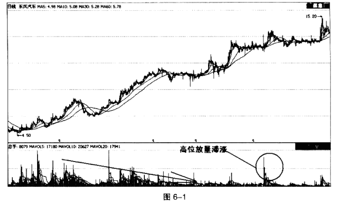 东风汽车(600006)(图6-1)见底4.5元后开始上涨,周K线图上可清楚看到,刚开始上攻时成交量很大,之后价越涨量越缩,到了15.2元高价时已形成了流畅的上涨图形。