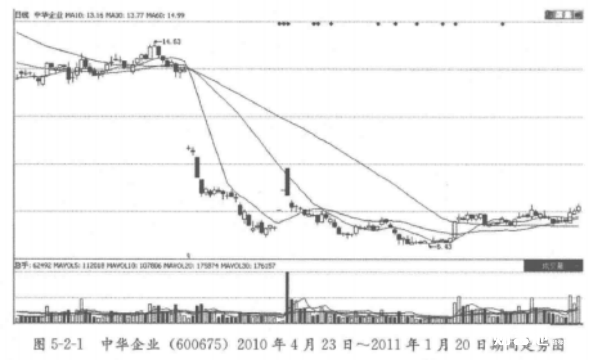 如图5-2-1,此股在长期停牌之后复牌,发布了一条利好消息:中华企业拟以8.3亿元收购上海房地有限公司40%股权,之后便连续出现了两个“一”字形涨停板。但这则消息的利好程度有限,随后此股出现了一个高开低走的放量大阴线形态,说明市场抛压沉重预示了短期反弹上涨走势的结束及随后再度下跌走势的展开。这个时候我们不可买股入场。