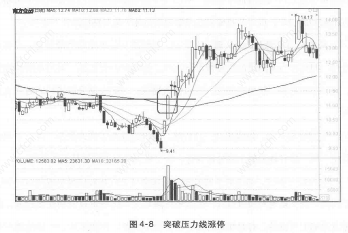 (4)追涨成功突破的股票。当个股形成突破性走势后,往往意味着股价已经打开上行空间,在阻力大幅度减小的情况下,比较容易出现强劲上升行情。因此,股价突破的位置往往正是最佳追涨的位置(图4-8)。