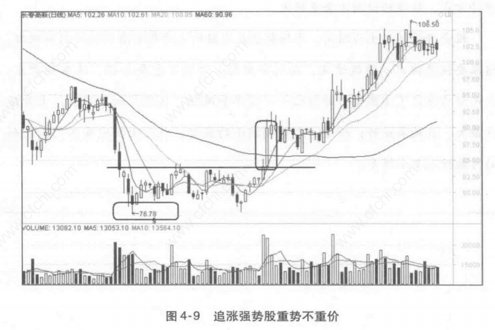 (1)追涨强势股要“重势不重价”,很多投资者在追涨强势股的过程中,往往会受个股基本面的影响,有时会认为这不是一个绩优股而放弃买进强势股(图4-9)。这种做法是错误的,因为买强势股重要的是趋势,这和买白马股重视业绩好坏的特点是不一样的。