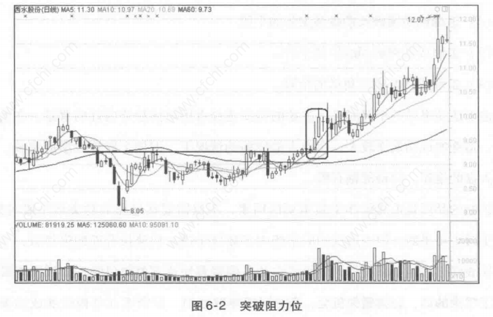 (3)股价对均线系统支撑位(或阻力位)的突破应以收盘价为标准。当股价向上突破均线系统阻力位时,股价应收在阻力位之上,相对应的成交量放大,表明股价向上突破成功,应及时介人(图6-2)。