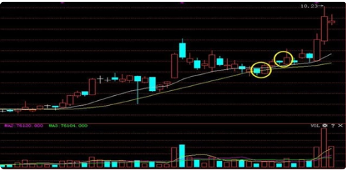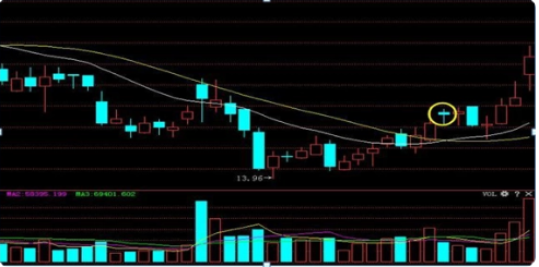 三、随着股价上升,在中大阳线之后常常会出现十字星线。若此时股价上扬且伴随着成交量放大,即为可信度极高的买进信号。