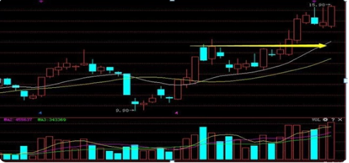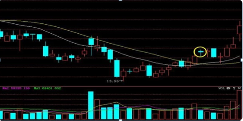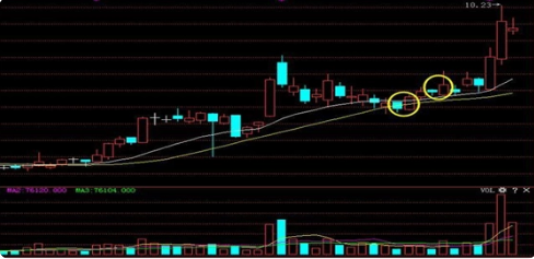 第一种追涨技巧:指随着股价上升,在中大阳线之后常常会出现十字星线。若此时股价上扬且伴随着成交量放大,即为可信度极高的买进信号。