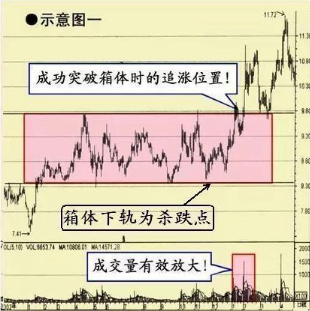 一段时间里股价在箱体里反复振荡运行,在成交量放大的配合下,股价终于突破箱体顶部、开始向上盘升,形成了比较好的买入位置(如上面示意图一所示)。