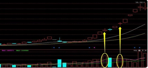 三、随着股价上升,在中大阳线之后常常会出现十字星线。若此时股价上扬且伴随着成交量放大,即为可信度极高的买进信号。