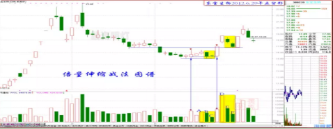 再看DEF三根量柱,F柱比D柱缩量一倍,EF二柱的平均高度相对D柱也是缩倍量,这又是典型的“缩倍双阴”,若是在F柱后的“阳过阴”时介入,又是一个半涨停板。