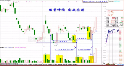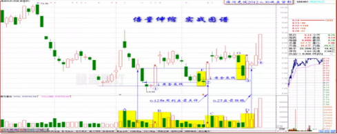 所谓“倍量伸缩”,就是“伸倍量柱+缩倍量柱”的组合,“凹底倍量伸缩”,就是在股价走势的“凹底部位”,出现“倍量伸缩”状态时关注之,一旦踩到我们预设的攻防线上,就是擒拿时机。它是“凹底淘金“战法的补充和升华。