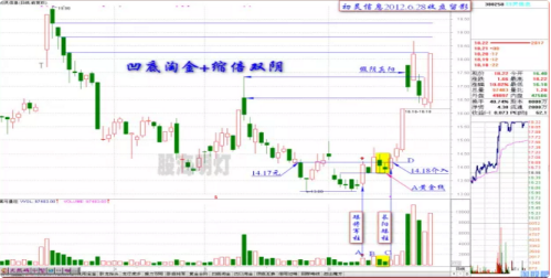 请看图中B柱后面的双阴,后者比前者缩量一倍,二者相加除以二的高度,正好是其前面B柱的缩量一倍。这就是典型的“缩倍双阴”。当发现这个“缩倍双阴”之后,就要随时准备伏击。伏击的最佳位置是不破A黄金 线并抬头向上或大阴实顶的位置D即14.17元。