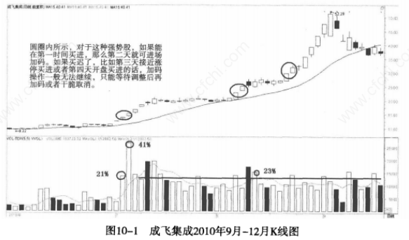 加码的时候需要特别注意的一点就是避免追高。如果觉得可能会追高,应该等待价格回调之后,再进场进行加码,这一点很关键。但如果加码加得不好,也会影响之后的操作。对于强度比较高,确定性比较强的个股,次日即可进场加码。