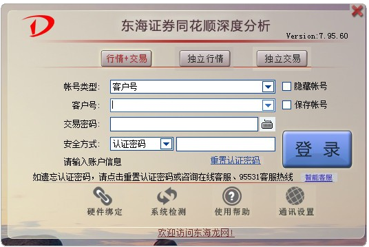 东海证券同花顺新一代是一款行情、交易、资讯为一体的在线股票交易软件,提供3种登录方式,即行情+交易、独立行情、独立交易。单击独立行情,即可进入行情系统。东海证券同花顺行情+交易、独立交易进需要在“客户号”一栏输入您客户号、交易密码,选择对应的安全方式并输入相关口令或密码,东海证券同花顺点击登录即可享受到我们提供的各项服务。东海证券同花顺拥有先进完善的网上交易系统,集合多种资讯信息和财务分析系统,能够为投资者提供先人一步的股票交易服务。