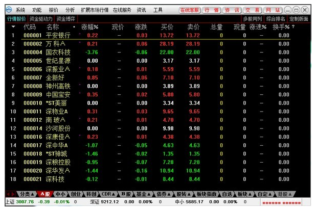 【状态栏】位于画面的下方,分为四个部分:指数栏、红绿灯、系统显示区、预警(网络版、图文版)/数据显示区(盘后版)。