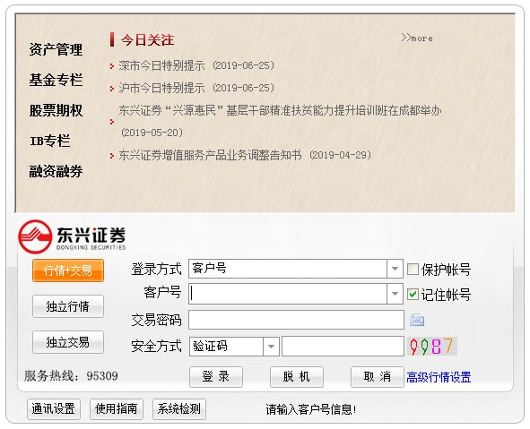 4、支持客户自设置预留信息提示,此举为防止客户登录到仿冒的东兴证券委托主站。5、支持港股通、创业版、股指期货、商品期货的行情揭示。