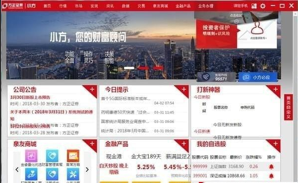 方正证券小方是最新推出的交易软件,是一款全功能、全景资讯、智能分析的行情交易PC客户端,包括行情交易、泉友商城、金融产品、市场全景、发现事件、资讯频道、一键打新、实时分析及数据解读等功能。