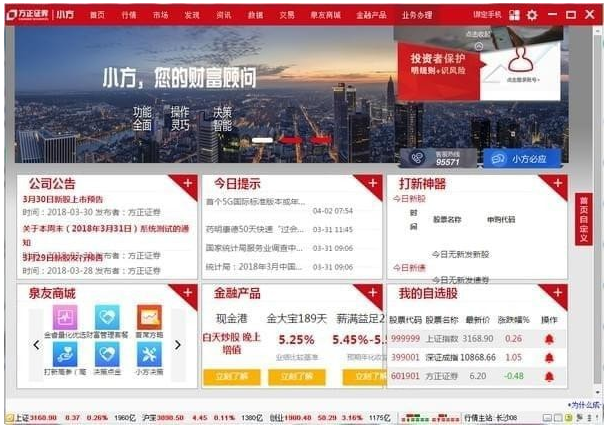 方正证券小方是最新推出的交易软件,是一款全功能、全景资讯、智能分析的行情交易PC客户端,包括行情交易、泉友商城、金融产品、市场全景、发现事件、资讯频道、一键打新、实时分析及数据解读等功能。