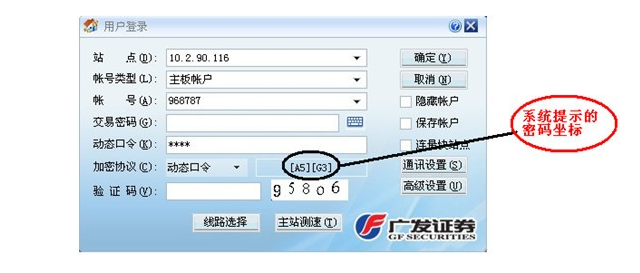 广发口令卡的背面印有5*8矩阵,共40格,每一格印有2位数字,每一个卡对应唯一的序列号,因此,每一个口令卡所印制的数字均不相同。只要经过简单的将口令卡跟用户帐号绑定操作并开通帐号后,登陆系统会随机指示两个座标,正确输入相应位置数字后才能进入系统。