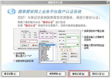首次登录国泰君安大智慧会要求进行身份认证,由于身份认证可以把交易客户和非交易客户,高价值和普通客户予以区分进行针对性服务,所以建议国泰君安网上交易客户主动通过身份认证(非国泰君安网上交易客户可以跳过认证),认证方法如下: