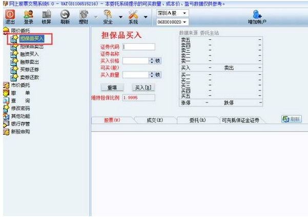选择左侧框内【限价委托】-【担保品买入】;在证券代码框输入担保证券代码,或在右下方【可充抵保证金证券】栏选择要买入的担保证券,在买入价格框输入担保品买入价格;在买入数量框输入买入的担保证券数量;点击【买入】提交。