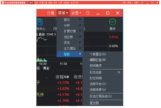 【菜单栏】:位于终端界面左上方,包括首页、自选、扩展行情、数据、资讯、交易、优品城、业务办理、行情、设置等多个栏目。下拉菜单包含报价、分析、扩展行情、创业板、资讯、主力增仓、智能应用能。终端的基本操作方法、功能都收罗其中,方便您快捷使用。