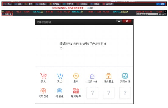 【快捷按钮】:快捷按钮位于指数条上方,内容包括买入、卖出、撤单、我的持仓、场内基金、沪深市场、我的自选、港股通、融资融券等。所显示的快捷按钮可进行自定义设置,也可隐藏快捷按钮。