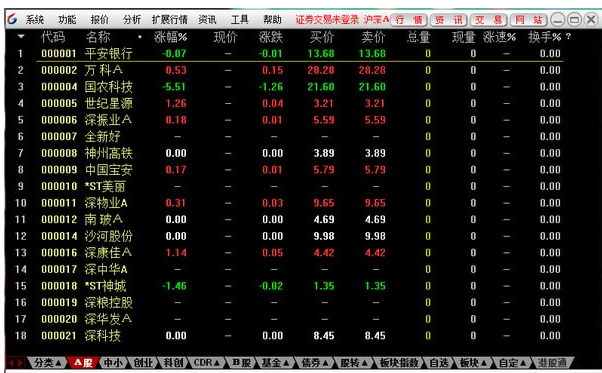 初始版面、报价分析、即时分析、基本分析、技术分析、报表分析、资讯系统、定制版面、交易委托、理财金算盘、个人理财、在线人气、专家系统、公式管理器、公式编辑器、选股器、预警系统。