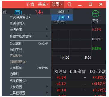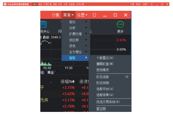 【菜单栏】:位于终端界面左上方,包括首页、自选、扩展行情、数据、资讯、交易、优品城、业务办理、行情、设置等多个栏目。下拉菜单包含报价、分析、扩展行情、创业板、资讯、主力增仓、智能应用能。终端的基本操作方法、功能都收罗其中,方便您快捷使用。