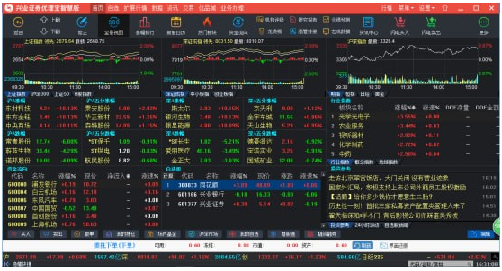打开软件,“兴业证券优理宝智慧版”程序界面如下图,由菜单栏、工具栏、主窗口、指数条和信息栏和等组成。