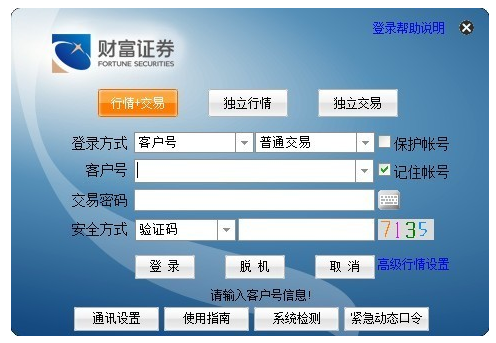 如果您只希望通过客户端浏览行情,可以点击“独立行情”按钮,直接登录财富快车网上行情系统,不需要输入客户号、交易密码。