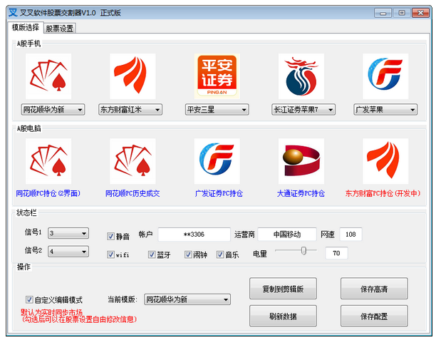 股票交割器是一款能够帮助喜欢炒股的股民进行选股交易以及股票交割的软件,软件能够在电脑上显示手机页面,支持对国内常见的如同花顺、东方财富等多个交易平台进行数据查看和更新交易截图,是一款功能非常强大的选股炒股软件。