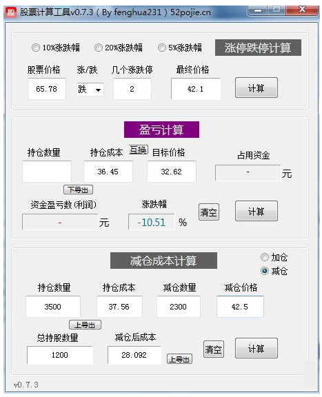 股票计算工具是一个增强型股票计算软件,工具开发初衷是找了很久没找到适合自己用的股票计算工具,所以开始自学易语言然后开发的,支持涨跌幅计算,持仓价格盈亏比计算,加仓减仓计算功能!