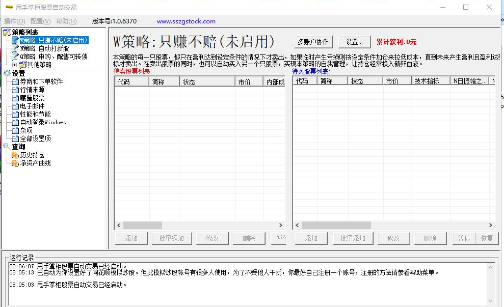 甩手掌柜自动交易程序已经由很多人实战使用多年,但仍不排除有出错的可能,如果不幸在你的电脑上运行出错且给你带来了经济损失,本人不承担任何赔偿责任。
