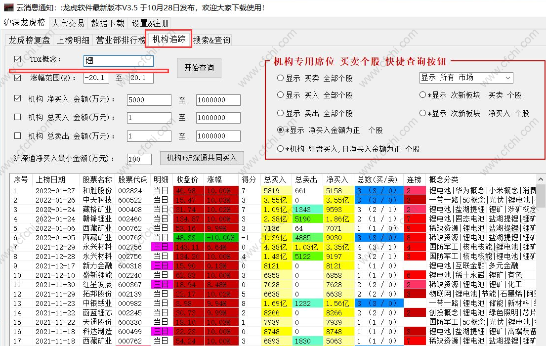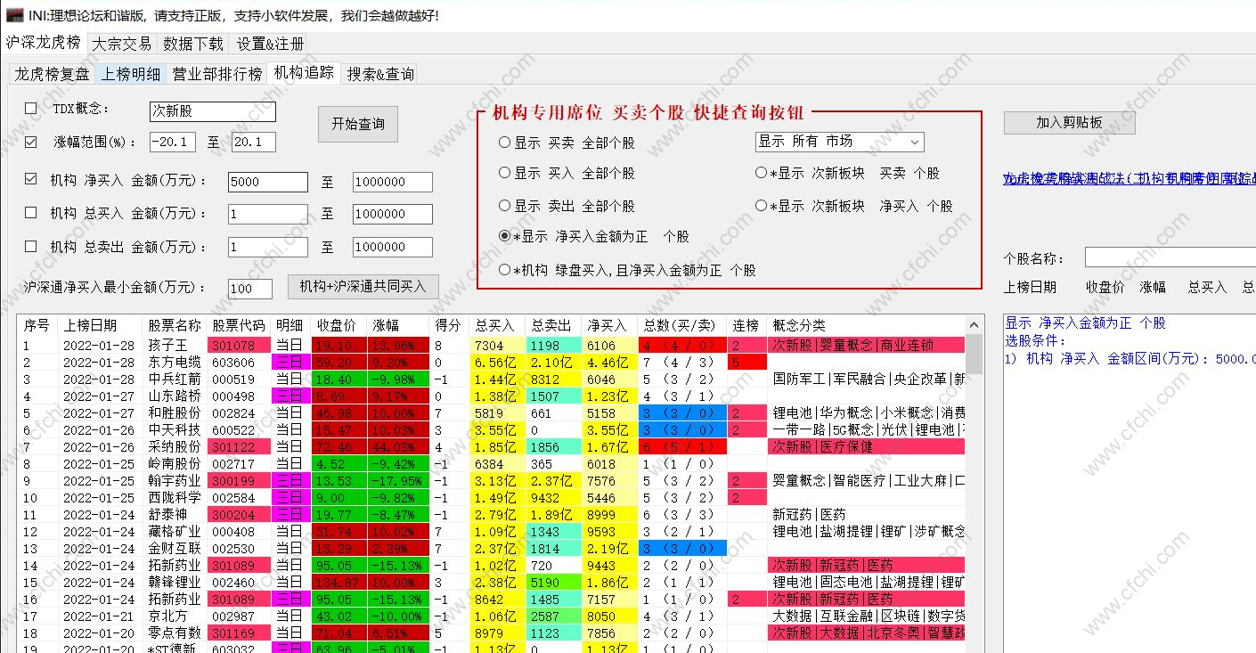 2. 第二个功能:机构追踪 功能,可以设定 概念,买入金额进行过滤选股。