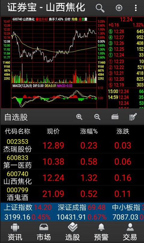 一款很棒的免费手机股票软件,拥有实时行情、分时图、K线图、买卖点提示及条件选股、预警等丰富功能,独有的指标即时预警,让您轻松获得即将上涨的股票。随时切换分时图、K线图分析指标,查看当天全部成交明细,查看主力、散户资金进出情况,查看个股成交量比、换手率、市盈率、流通市值、总股本、流通股本、每股收益等等股票参数。帮助菜单中自带详细的使用指南,操作简单明了,功能丰富,从此丢掉笨重的电脑,一部手机畅游天下,是您股票投资的好帮手。