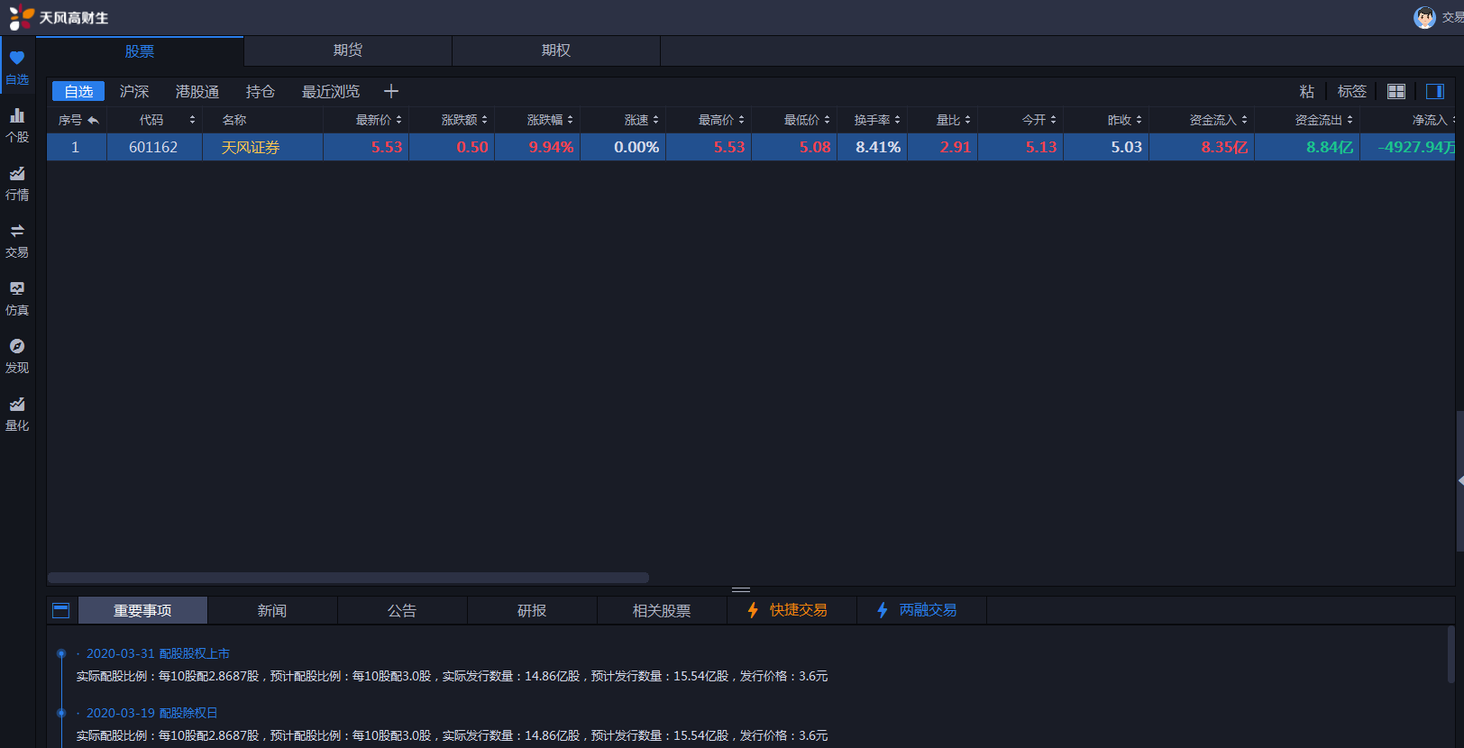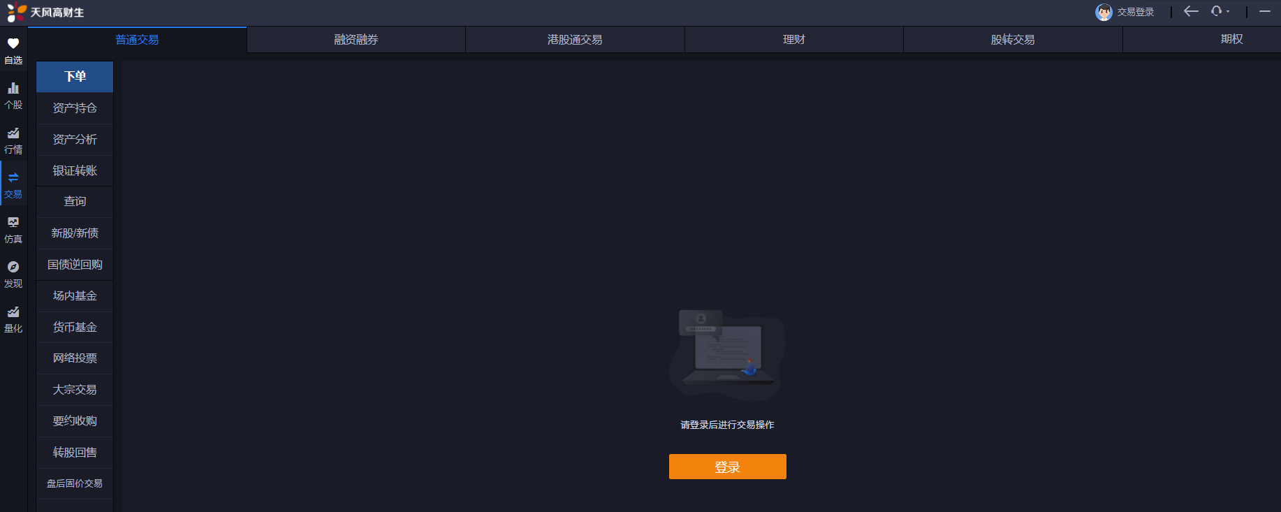 快捷交易:与行情相互融合的快捷交易,包含普通交易、两融交易、港股通、新股申购、场外基金;
