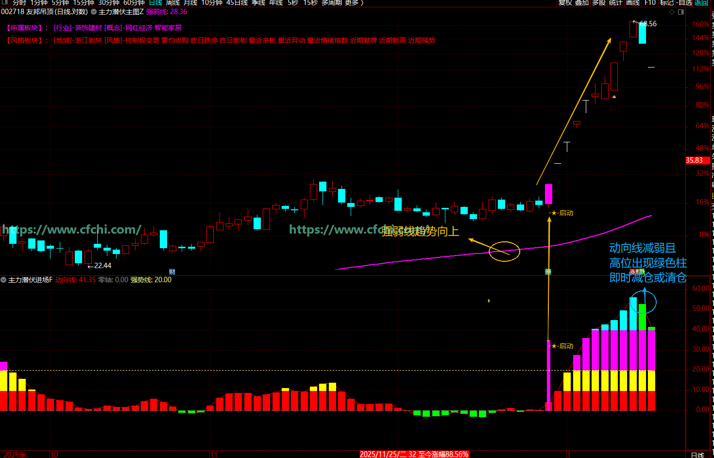 推荐理由:图形辨识度高,柱子长短代表力度,白色代表洗盘,红色代表出货,黄色代表拉升。可以导入诊断一下你手持个股在什么阶段