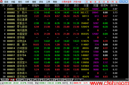 8.敲击“57”回车后,就出现“无基金A股”报价表。