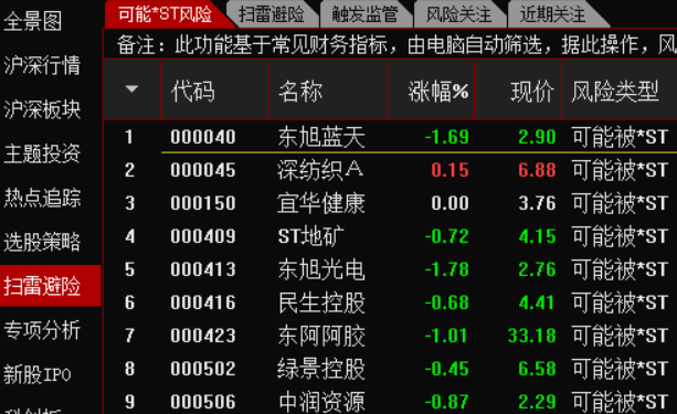 3、”市场“中”扫雷避险“部分 加”触发监管、风险关注、近期关注”三个版面