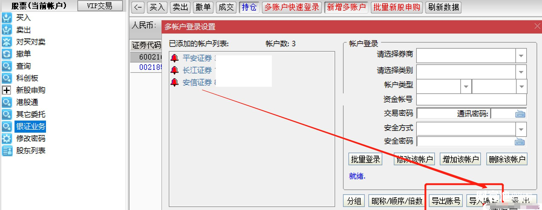 跨券商不能选择券商,通过老版的“多账户批量设置”的导出多券商账号,再导入本TDX。