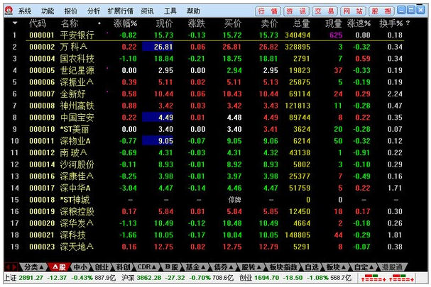 8.敲击“57”回车后,就出现“无基金A股”报价表。