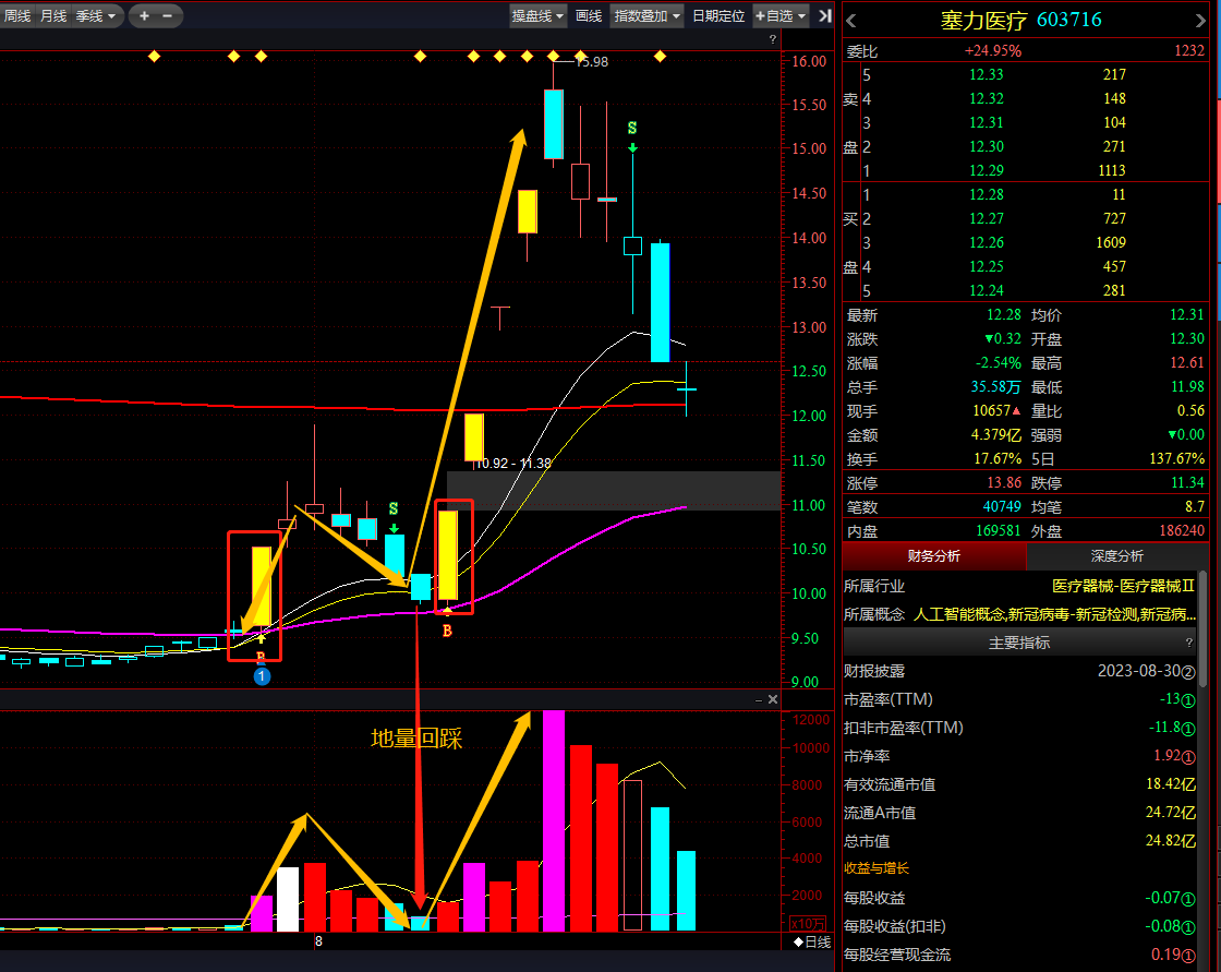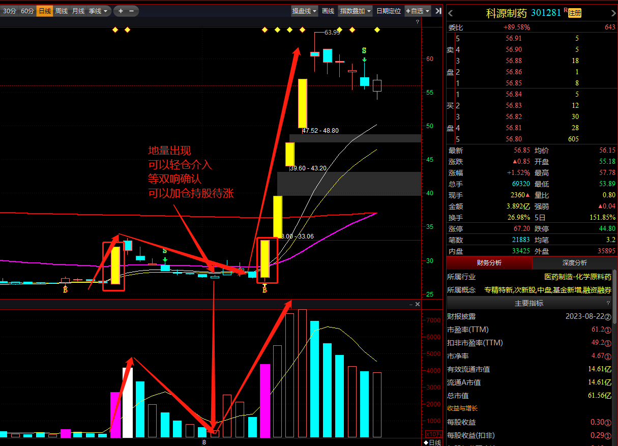 3、回落K线3至7根最好(例如赛力医疗中间回调6天),也有的主力洗盘时间比较长,比如科源制药;