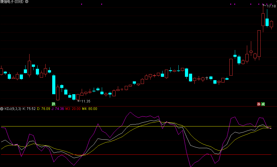 给您的KDJ指标加两条线超卖,超买线:20和80;也就是在原代码上加上M3、M4这两行代码